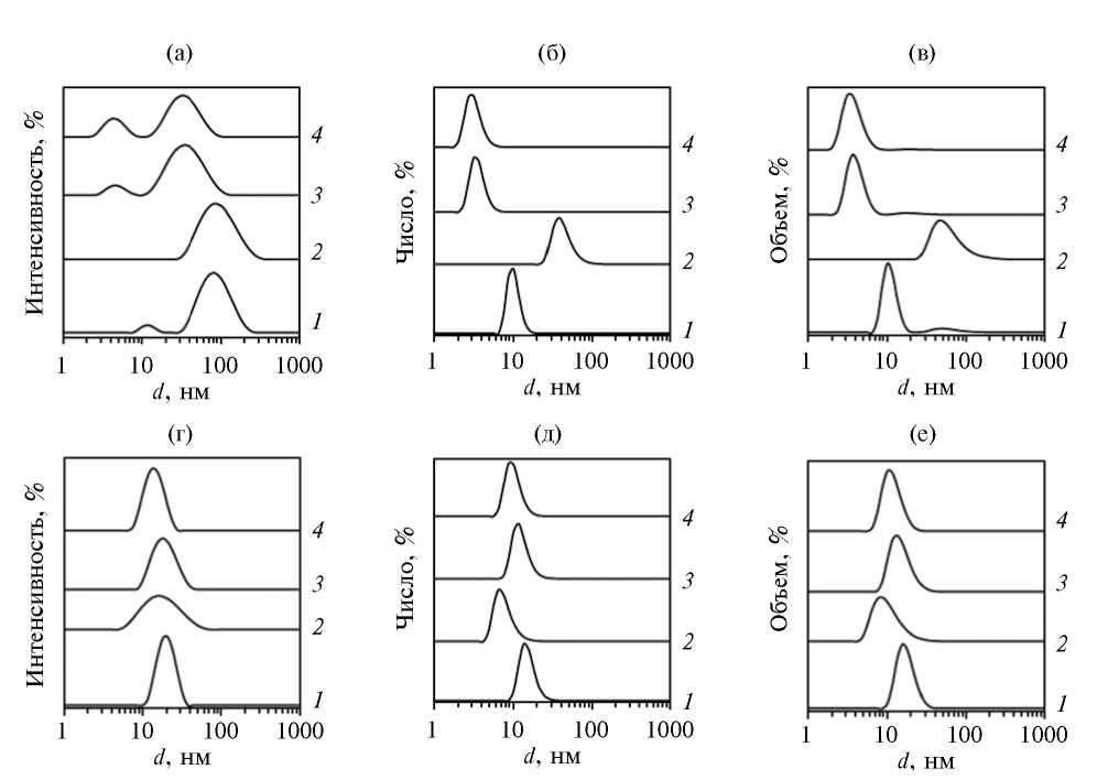 Распределения частиц по размерам в единицах интенсивности получены из анализа автокорреляционных функций с использованием алгоритма General purpose программного обеспечения анализатора. Распределение по размерам в единицах объема и числа частиц проводилось согласно теории Ми. Средний размер частиц в системе определяли методом кумулянтов. Гидродинамический диаметр частиц рассчитывали по уравнению Стокса–Эйнштейна: