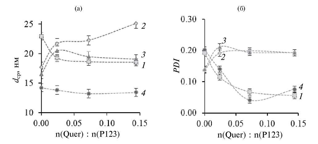 При более высоких температурах в зависимости от содержания сорастворителя и полифенола в растворе можно проследить изменение их роли в структурообразовании неионогенного ПАВ. Мономодальность распределения при 40°C позволяет использовать для характеристики системы средний гидродинамический диаметр (dh). Как показано выше, влияние этанола при T = 40°С состоит в увеличении размера от dh = 20 нм до 23 нм (при соотношении n(EtOH) : n(P123) = 80 : 1) и уменьшении до 14–18 нм при остальных составах раствора (от n(EtOH) : n(P123) = 160 : 1 до n(EtOH) : n(P123) = 370 : 1). В присутствии кверцетина изменение размера dh и полидисперсности PDI мицелл блоксополимера немонотонно при варьировании состава растворителя (рис. 6).