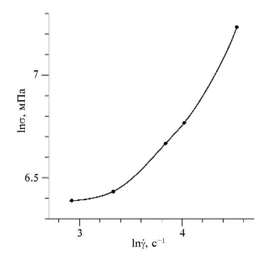 Полученные результаты не могут быть описаны также и в рамках модели вязко-пластичной жидкости. Согласно этой модели, скорость и напряжение сдвига связаны следующим образом: . В логарифмических координатах эта зависимость представляет собой прямую линию, положение и наклон которой определяются величинами вязкости и показателя пластичности. Представленная на рис. 2 в логарифмическом масштабе зависимость напряжения сдвига от скорости сдвига также не может быть аппроксимирована прямой линией.