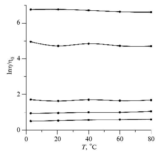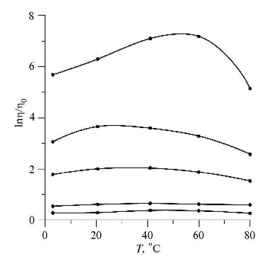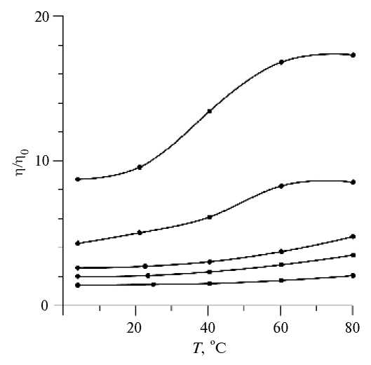 Концентрационные зависимости относительной вязкости первого и второго образцов тоже качественно отличаются. На рис. 6 представлено семейство концентрационных зависимостей относительной вязкости при различных температурах.