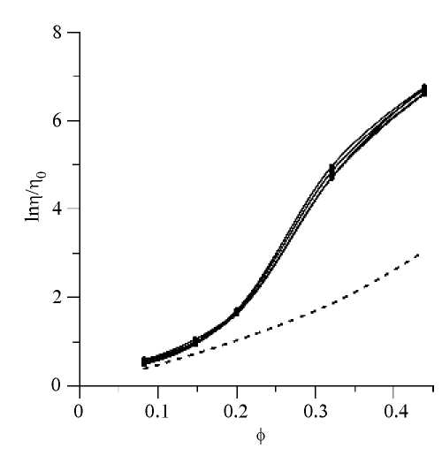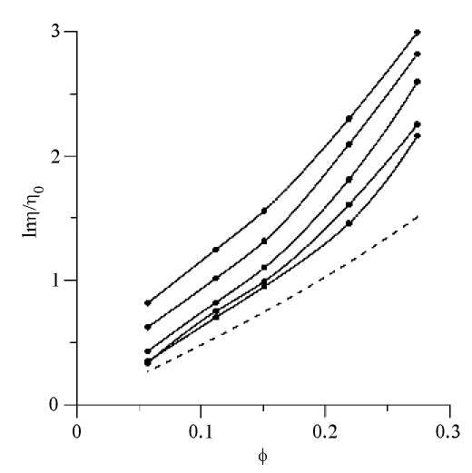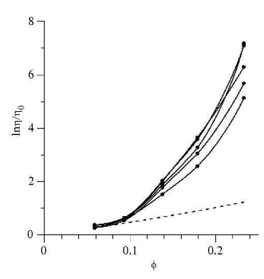 Рис. 4. Концентрационная зависимость относительной вязкости первой жидкости. Температура измерений равна 4, 23, 40.6, 60.3, 80.2°C и растет снизу вверх. Пунктирная линия – расчет по модифицированной формуле Чонга [10].
