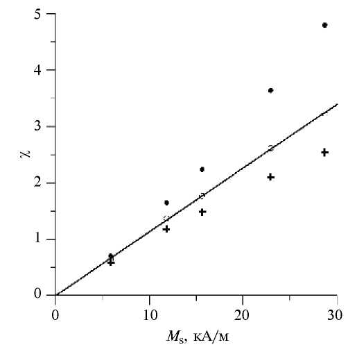 Рис. 9. Зависимость начальной восприимчивости первой жидкости от ее намагниченности насыщения. Точки – результаты измерений, круги – расчет восприимчивости Ланжевена с использованием коэффициента при квадратичном слагаемом ряда 0.1504, кресты – расчет восприимчивости Ланжевена согласно теории модифицированного эффективного поля.