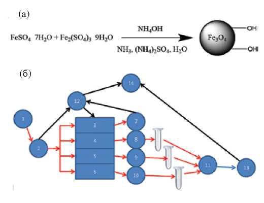 За основу была взята химическая реакция осаждения магнетита из сульфатов железа (II) и (III) гидроксидом аммония (рис. 1а). Экспериментально установлено, что при достижении значения pH = 8–9 происходит образование кристаллитов размером 15–20 нм. Для увеличения буферной емкости используется аммоний щавелевокислый. Это связано с величиной произведения растворимости оксидов железа (II) и (III). Выбор реактивов был продиктован простотой отмывки от сульфат-ионов и аммиака. Установка, использованная для микрофлюидного синтеза, работала на принципе вытеснения реагентов из пробирок Эппендорфа под действием повышенного регулируемого давления. Для этого были предусмотрены прецизионные регуляторы давления ITV0010-2ML (3–6, SMC Corporation, Япония), которые управлялись микроконтроллером Arduino Nano (12, Arduino, Италия) в зависимости от сигналов датчиков давления MPX5050GP (7–10, Freescale Semiconductor, США). Исходным источников давления служил безмасляный компрессор (1), давление которого контролировалось входным датчиком давления MPX5700 (2, Freescale Semiconductor, США). Реагенты подавались в МФЧ (11). Протекание реакции контролировали при помощи микроскопа со встроенной видеокамерой (13). Видеокамера и микроконтроллер управлялись персональным компьютером (14).