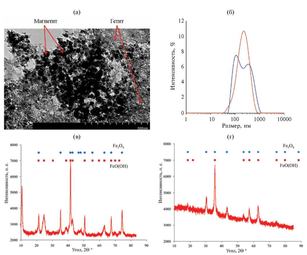 Изучение морфологии образцов ПЭМ (рис. 3а) для МНЧ, полученных при помощи МФЧ и в ОР, позволило сделать вывод о приблизительно одинаковых результатах. Образцы состоят из сферических НЧ с размером кристаллитов 15–20 нм и более мелких игольчатых кристаллов, которые, согласно данным рентгенофазового анализа (РФА, рис. 3в–г), состоят из магнетита (маггемита) и гетита соответственно.