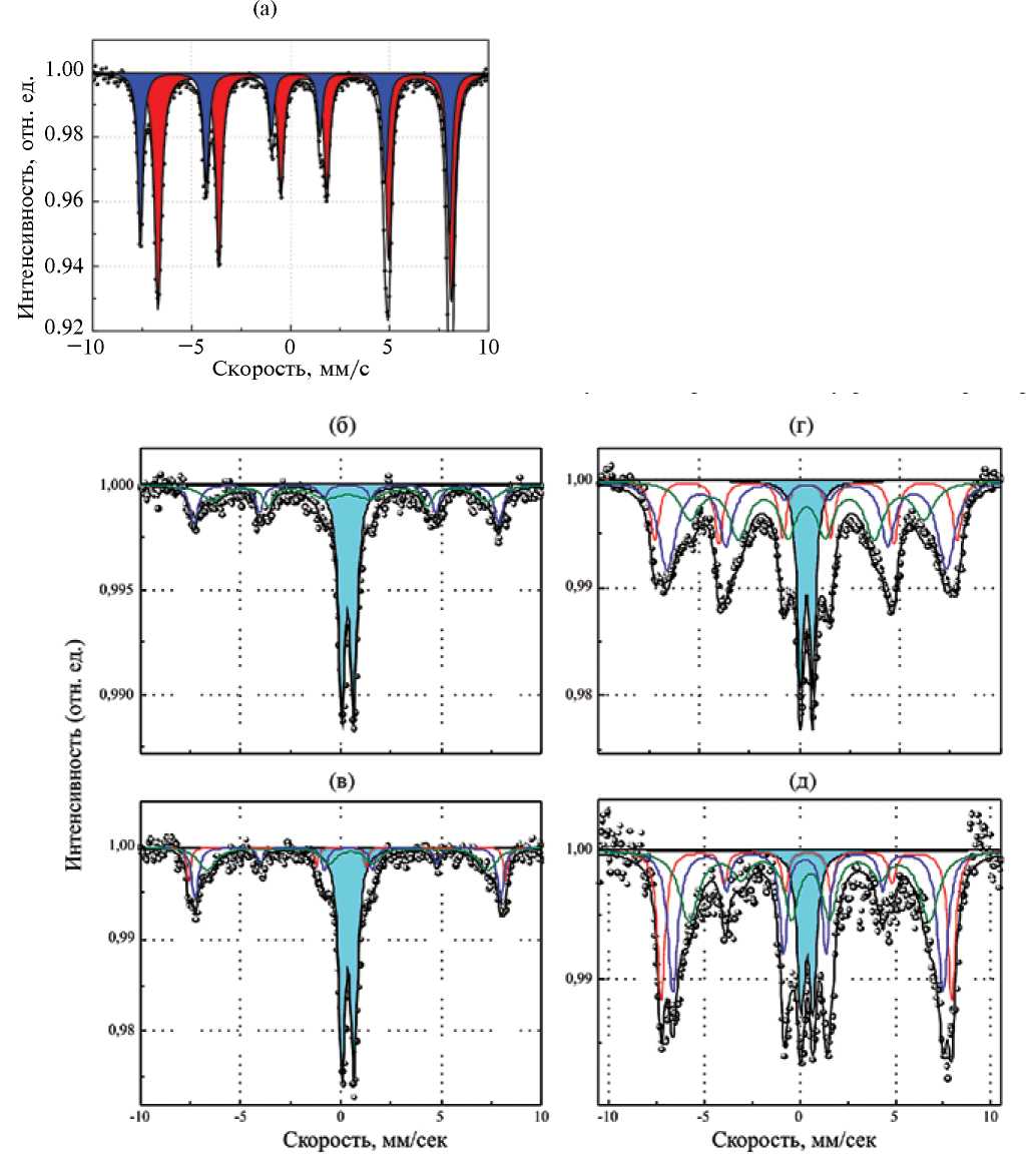 Рис. 4. Спектры ЯГР: кристаллический магнетит (а), МНЧ, полученные в ОР (б, в), МНЧ, полученные в МФЧ (г, д), измерения в магнитном поле (в, д), парамагнитная составляющая (🟦).
