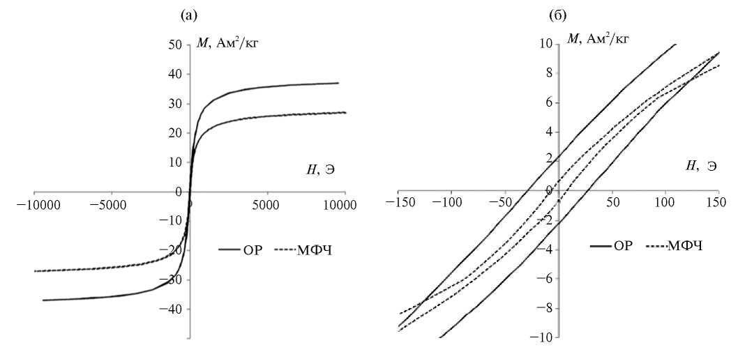 Результаты исследования образцов методом вибрационной магнитометрии приведены на рис. 5. Сравнение МНЧ двух типов показало, что при синтезе в МФЧ удельный магнитный момент насыщения ниже (27 А·м2/кг), чем при синтезе в ОР (37 А·м2/кг). Возможно, это связано с тем, что частицы, полученные микрофлюидным способом, состоят в основном из смеси магнетита и маггемита, тогда как МНЧ, полученные с использованием ОР, содержат преимущественно стехиометричный магнетит, удельный магнитный момент насыщения которого составляет 92–94 А·м2/кг, что на 12–20 А·м2/кг выше, чем у маггемита [37]. В обоих случаях значение удельного магнитного момента насыщения достаточно для реализации магнитоуправляемой доставки. Так, например, намагниченность насыщения магнитных жидкостей лежит в диапазоне 10–12 А·м2/кг [38]. Коэрцитивная сила образцов составила ~10 Э в случае синтеза в МФЧ и ~30 Э в случае синтеза в ОР, что выше характерных значений для МНЧ на основе оксидов железа при таких размерах кристаллитов [28]. Одним из возможных вариантов объяснения этих результатов, если опираться на более ранние работы авторов по МНЧ FemOn–SiO2 [34, 39], может быть влияние магнитостатического взаимодействия между отдельными МНЧ внутри агрегатов. Это предположение согласуется с данными о формировании агрегатов, полученными методом ДРС, и не противоречит наличию МНЧ в парамагнитном (или суперпарамагнитном) состоянии согласно данным спектроскопии ЯГР. Иным возможным объяснением более высоких значений коэрцитивной силы могло бы быть влияние фазы с малым магнитным моментом насыщения, но существенной коэрцитивностью (например, гематита), но согласно данным РФА и спектроскопии ЯГР, а также исходя из ранее полученных авторами результатов (см., например, [34, 39]) и литературных данных [37], такие фазы в составе МНЧ отсутствуют.