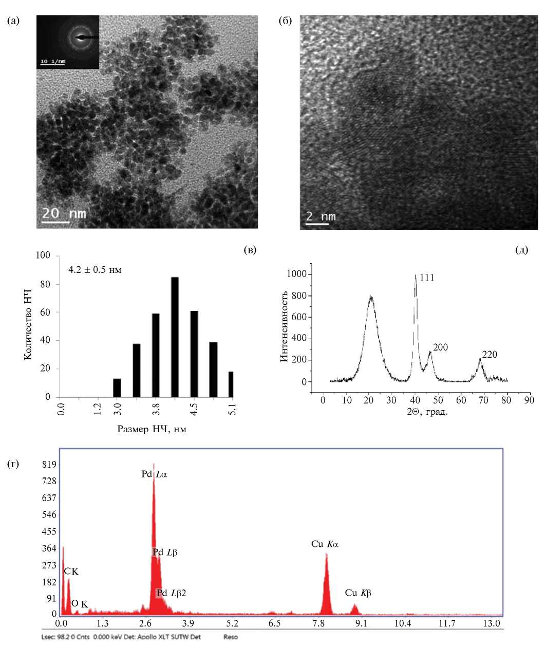 Микрофотографии наночастиц Pd, образующихся в системе Pd(Аcac)2 – n1 – H2 в метаноле (n = 1, СPd = 10 ммоль∙л-1), приведены на рис. 2а и 2б. На врезке слева (рис. 2a) представлена дифракционная картина выделенной области (SAED) образца. Статистическое распределение ~ 300 частиц по размерам, полученное с микрофотографий, представлено на рис. 2в. Наблюдаются частицы со средневзвешенным диаметром 5.3 ± 0.8 нм, при высоком разрешении на атомном уровне проявляется их кристаллическая структура (рис. 2б). По снимкам ПЭМ ВР были определены межплоскостные расстояния, равные 2.2421; 1.9531; 1.3841; 1.1716 Å, которым, согласно базе PDF-2, соответствуют индексы Миллера 111 (2.2458 Å), 200 (1.9451 Å), 220 (1.3754 Å) и 311 (1.1716 Å) для элементного палладия. Энергодисперсионный спектр наночастиц палладия на медной сетке, покрытой углеродом, подтвердил присутствие в выбранной точке образца (рис. 2г) таких элементов, как углерод, кислород, палладий и медь (материал сетки).