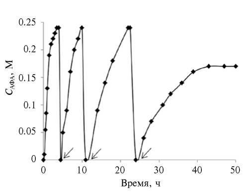 Рис. 6. Образование N-АФА на системе Pd(Аcac)2–Cin–H2 (СPd = 0.31 мМ; Sub/Pd = 1000; Vр-ра = 20 мл, Т = 60оС; PН2 = 5 атм, стрелками указано время внесения порции субстрата).