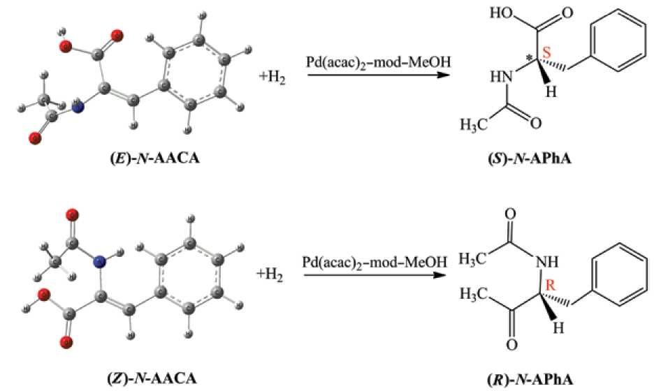 Рис. 7. Гидрирование геометрических изомеров (Z)-N-ААКК и (E)-N-ААКК c образованием энантиомеров N-АФА.