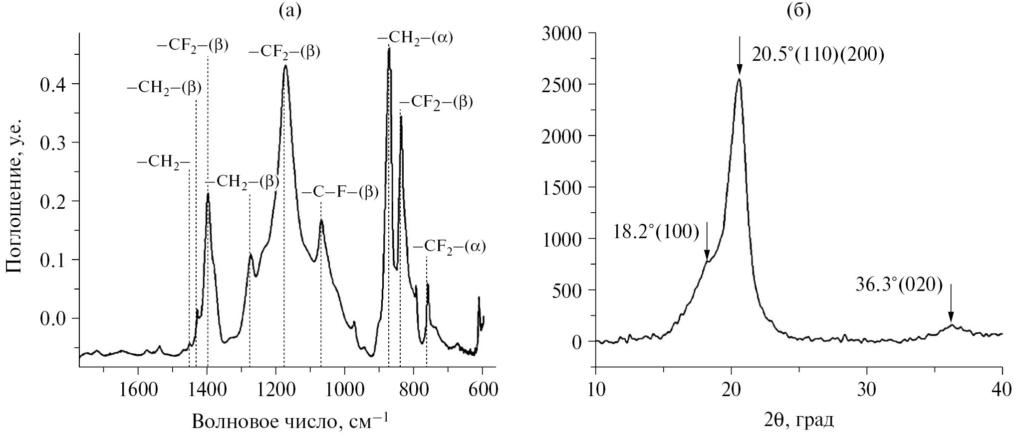 Рис. 3. ИК-Фурье спектр (а) и рентгенограмма (б) нановолоконного слоя из ПВДФ на поверхности мембраны ТМ (Ti)