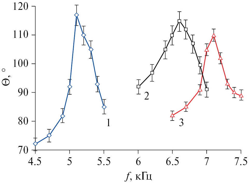 Рис. 5. Зависимость краевого угла материала, перенесенного на стеклянную пластинку, от частоты колебаний виброэлемента в период его межфазного синтеза в системе 0.10 М водный раствор HoCl3 / 0.05 М раствор стеариновой кислоты в хлороформе (1), гептане (2), декане (3)