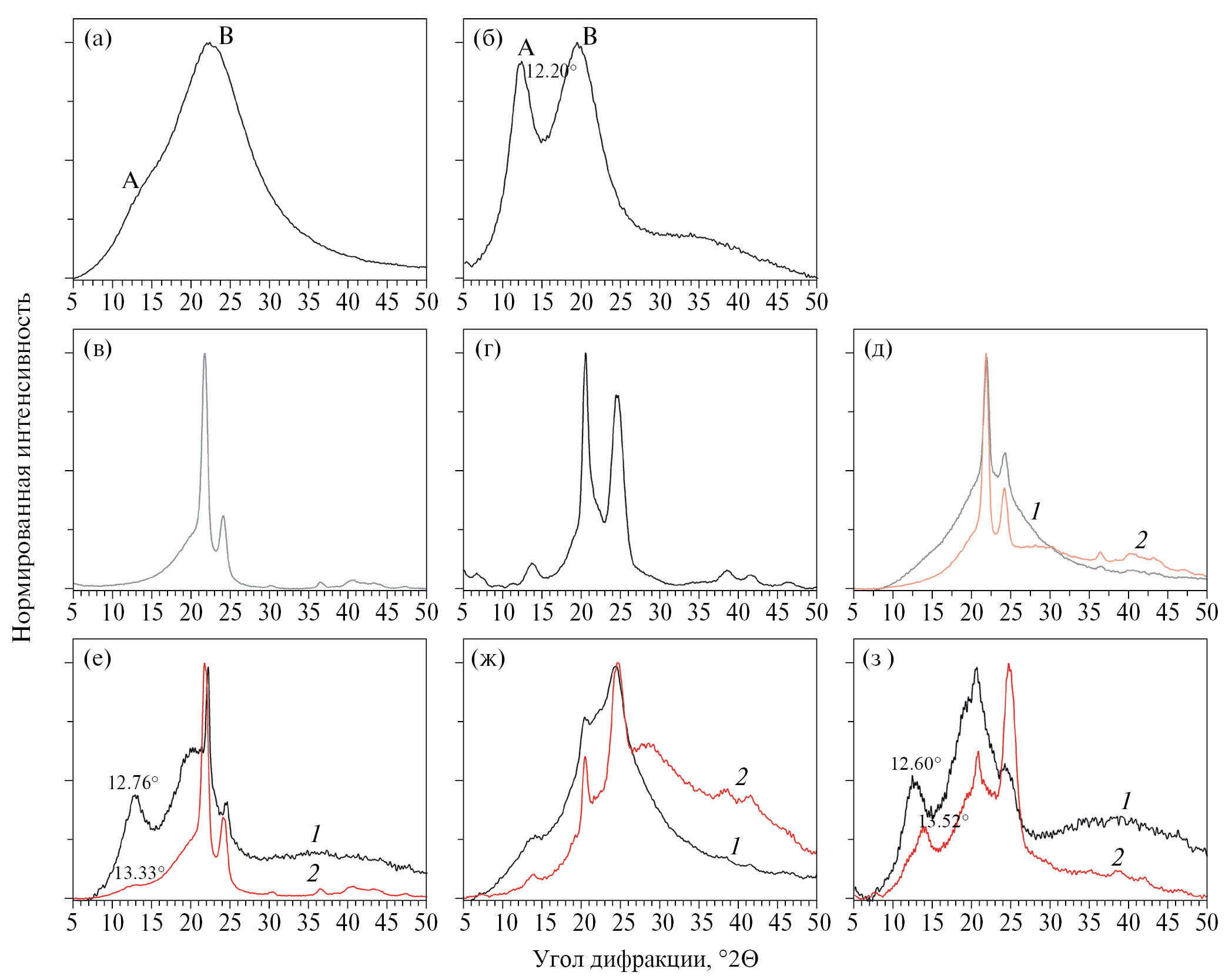Рис. 3. Дифрактограммы высокопористых полимерных матриц ПА и ПЭВД, а также полученных их них ионогелей, содержащих ионные жидкости BMIM DCA или BMIM TFSI, и ионогелей после длительного (24 ч) контакта с водой. (а) BMIM DCA, (б) BMIM TFSI, (в) ПЭВД, (г) ПА-6,6, (д) ПЭВД-DCA-М, (е) ПЭВД-TFSI-М, (ж) ПЭВД-DCA-M, (з) ПЭВД-TFSI-M. Дифрактограммы: 1 – ионогели до контакта с водой, 2 – ионогели после выдерживания в воде