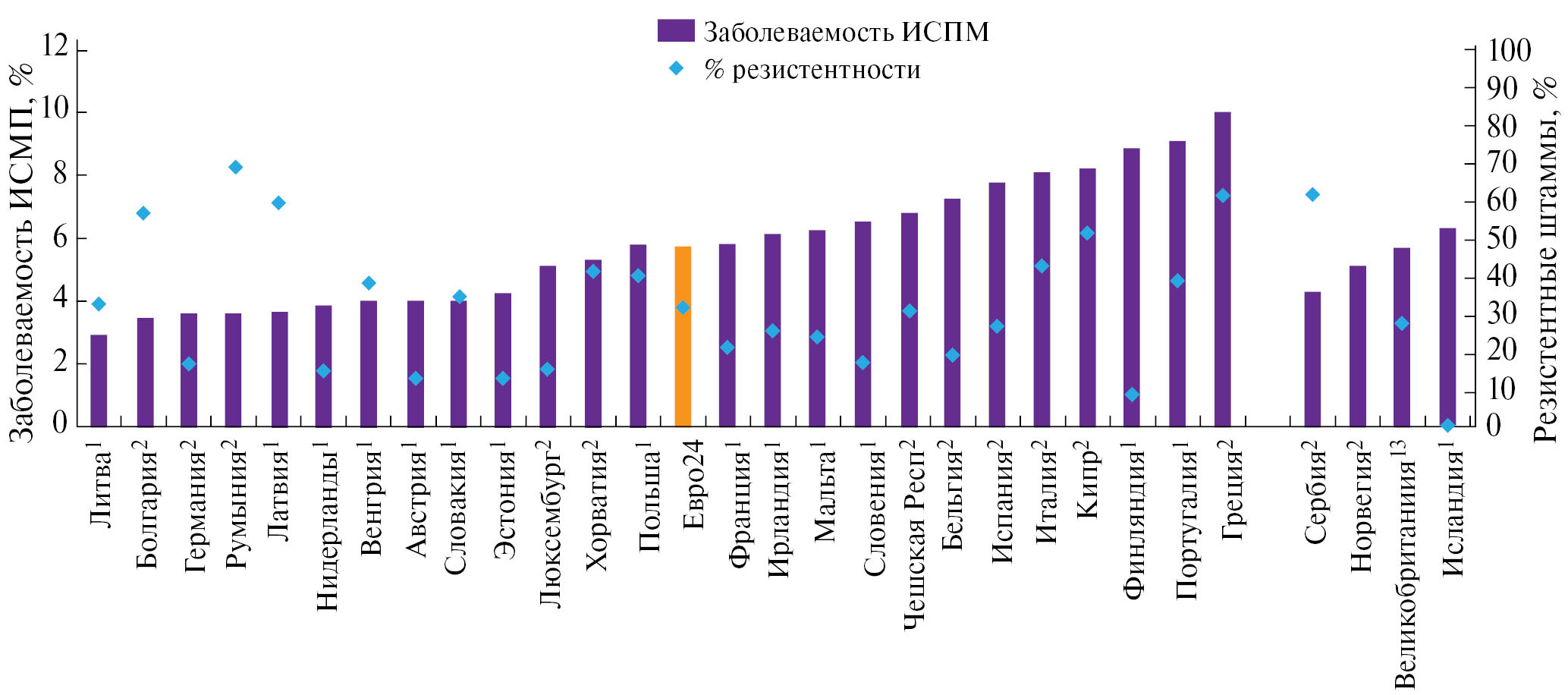 Рис. 1. Высота столбцов соответствует проценту госпитализированных пациентов в каждой стране с хотя бы одной ИСМП (левая ось), а отметки – доле этих инфекций, устойчивых к антибиотикам (правая ось), красный столбец – среднее значение по странам Европы, 2016–2017 гг. [18]
