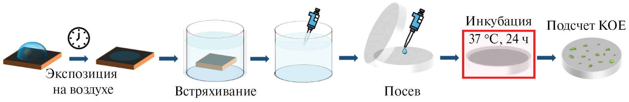 Схема протокола отображена на рис. 3. Эта методика позволила оценить изменение титра планктонных бактерий в суспензии, контактирующей с пластиной во времени, что помогло получить более точную характеристику бактерицидного действия экспериментальных поверхностей в условиях продолжительного контакта с бактериальной средой.