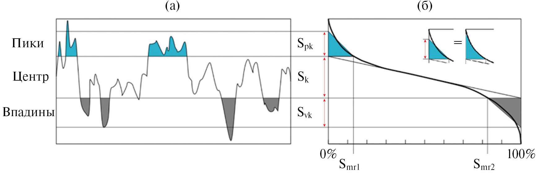 Шероховатый слой делится на три зоны: центр, пики (закрашены голубым цветом) и впадины (закрашены серым цветом). Параметры Spk и Svk отражают среднюю (или приведенную) высоту части рельефа, которая находится, соответственно, выше или ниже центральной части рельефа.