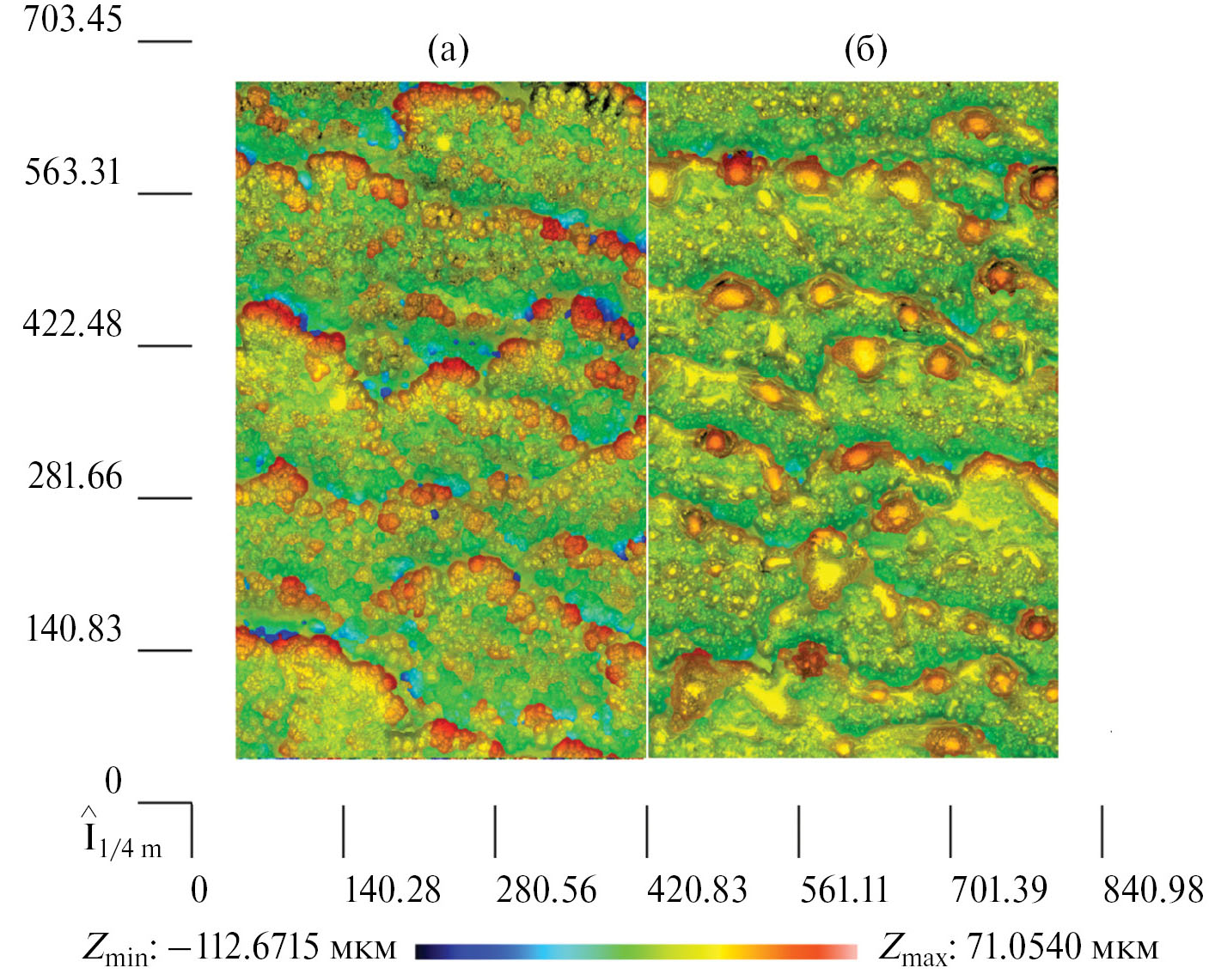 Рис. 6. Трехмерные снимки поверхностей: а – базового режима Cu20, б – режима дополнительной обработки 2A