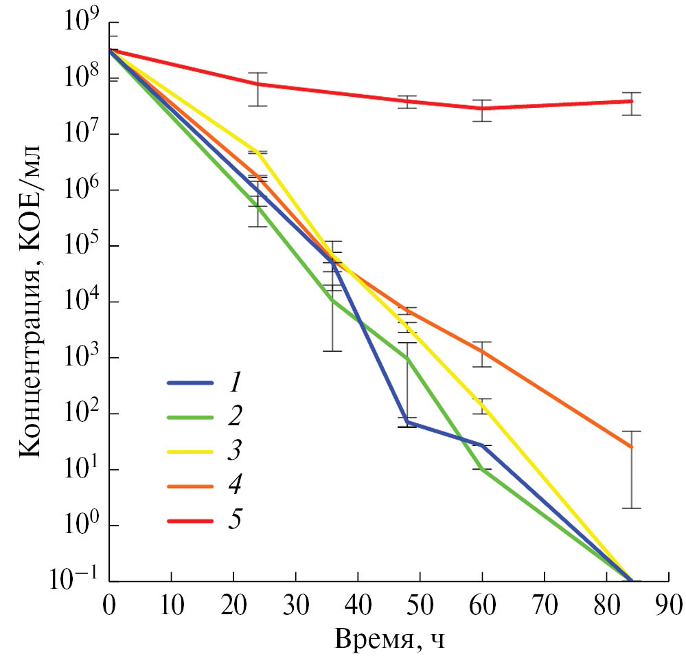 Рис. 8. Изменение концентрации бактерий в объеме дисперсии при контакте с различными образцами: 1 – гладкая медная пластина, 2 – Cu20, 3 – 2А, 4 – 2А-М (пропитка мирамистином), 5 – контроль бактериальной дисперсии