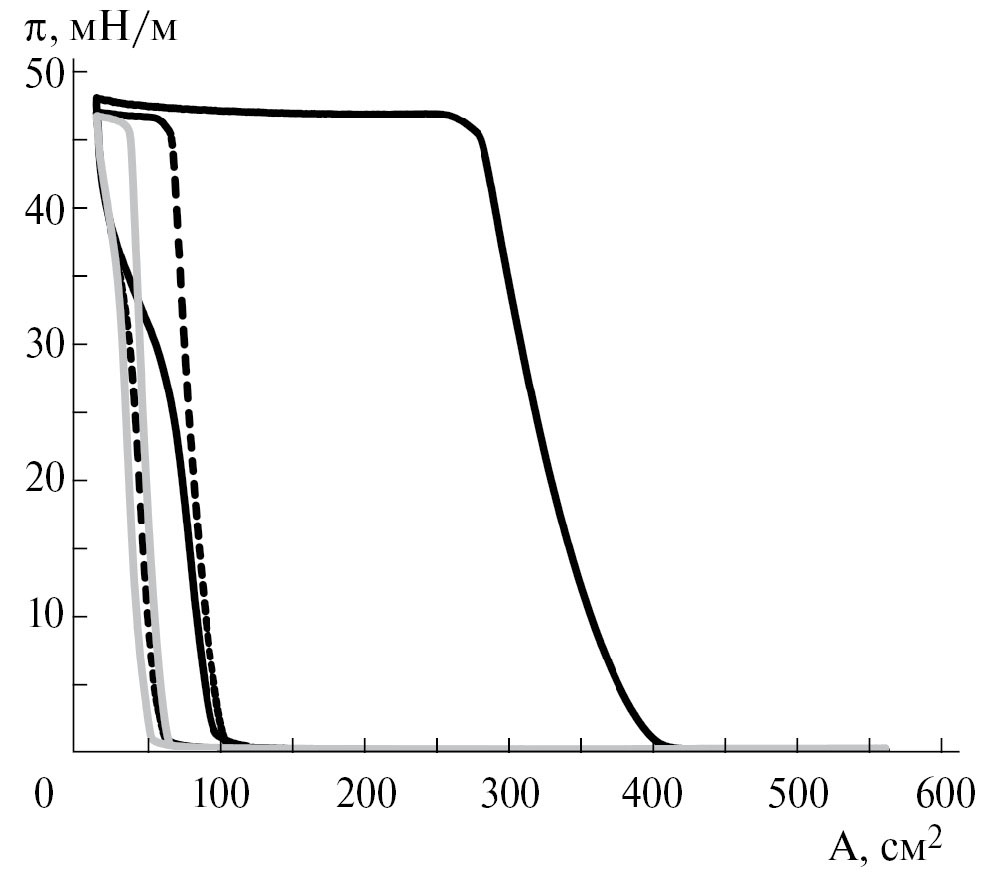 Рис. 9. Изотермы сжатия/растяжения для нанесенного монослоя p4. Черная, пунктирная и серая линии соответствуют первому, второму и третьему циклам сжатия/растяжения, соответственно