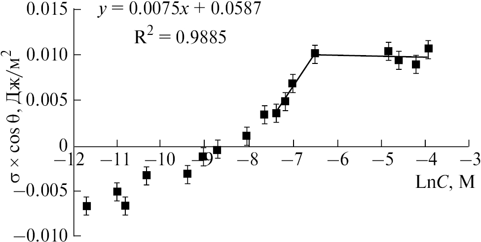 На основе изотермы смачивания (рис. 2) и тензиометрических данных для пленки Loparex получена зависимость σЖГcosθ от lnC (рис. 4). Как следует из рис. 4, в области концентраций растворов Tween 80 от 1.5 до 20 мМ функция σЖГcosθ сохраняет постоянство с точностью ±5.8%. Данному плато предшествует участок, определяющий предельную адсорбцию и хорошо описывающийся (R2 = 0.9885) линейным уравнением: