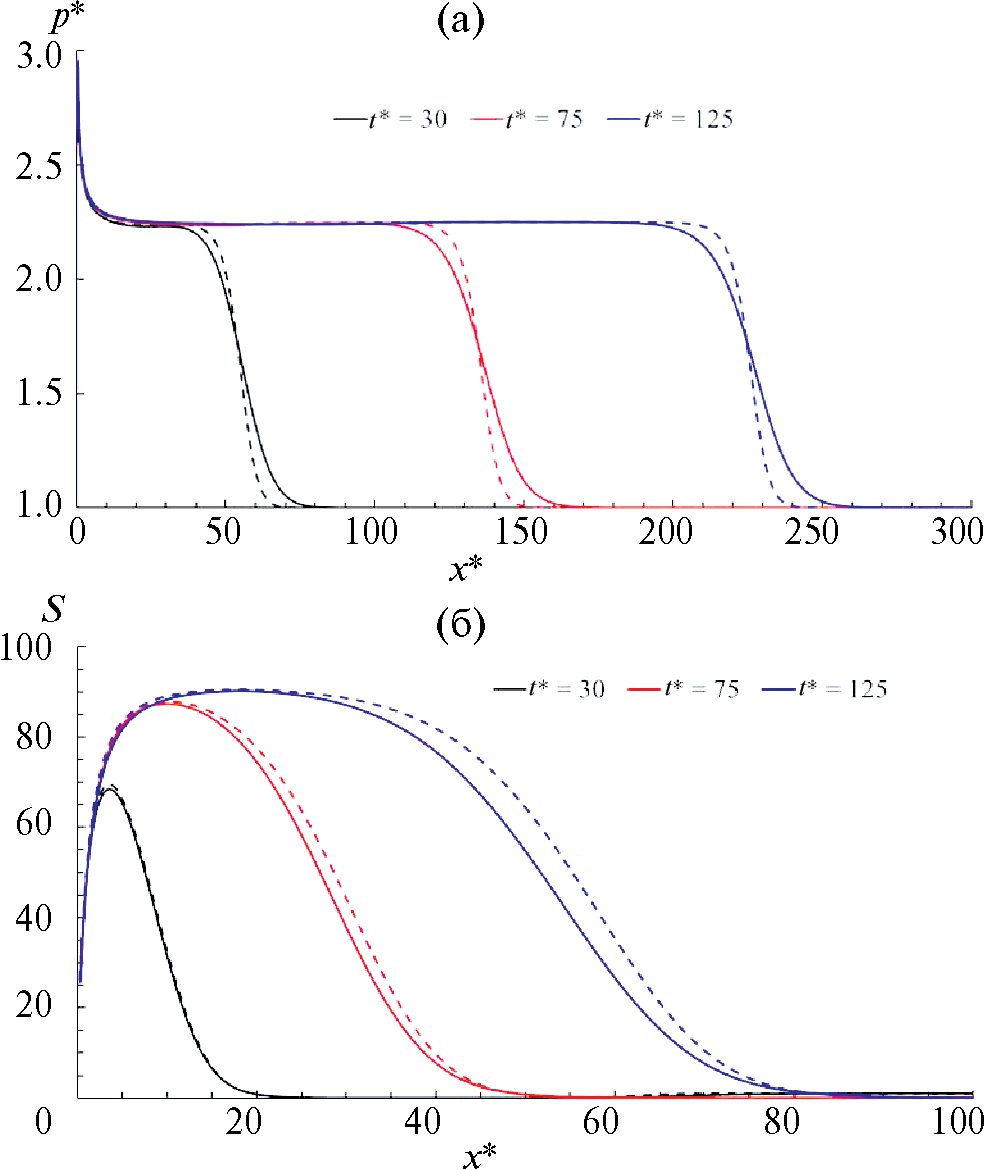 Рис. 4. Зависимости давления и степени пересыщения от координаты в различные моменты времени для воды при начальной температуре 273.15 К, Тhot/ Тcold = 1.1 (сплошные линии – неравномерная сетка, штриховые линии – равномерная сетка).