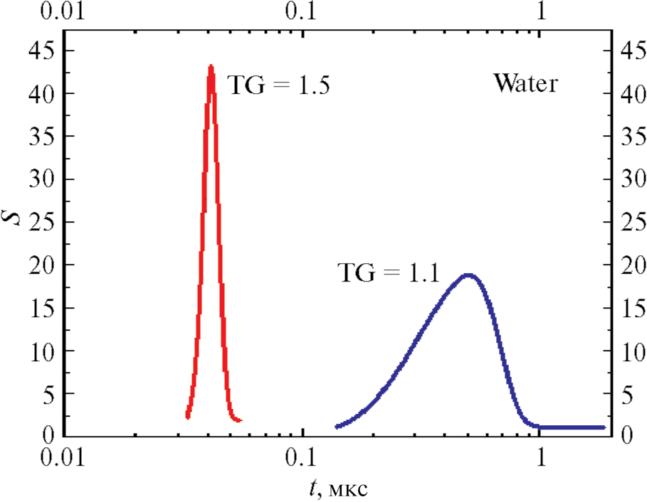 Рис. 9–11 иллюстрируют влияние величины TG при неизменном значении Тcold на процесс объемной конденсации вблизи межфазной поверхности при интенсивном испарении. На рис. 9 показаны зависимости степени пересыщения от времени. Видно, что увеличение TG при неизменной величине Тcold приводит к тому, что максимальная степень пересыщения увеличивается, а время существования пересыщенного состояния сокращается. Тем не менее образование конденсационного аэрозоля успевает произойти.