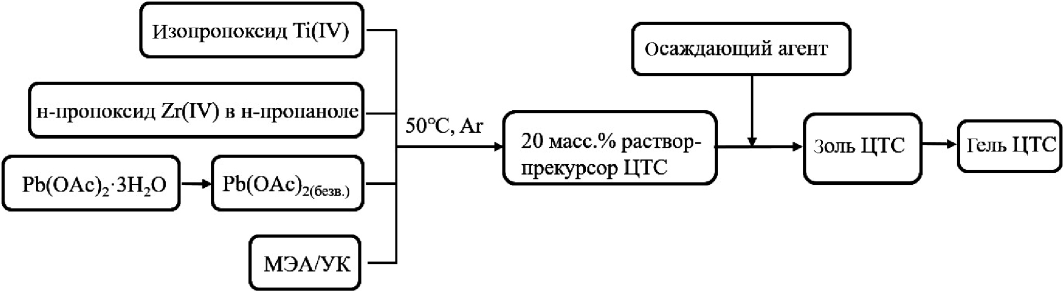 Гель-прекурсор ЦТС получали золь–гель методом. Предварительно дегидратированный (конечная температура 105оС, остаточное давление 20–30 мм рт. ст.) тригидрат ацетата свинца (II) Pb(CH3COO)2∙3H2O (99+%, Acros Organics, Бельгия), н-пропоксид циркония (IV) Zr(OCH2CH2CH3)4 (70% раствор в 1-пропаноле CH3CH2CH2OH) (Sigma-Aldrich, США) и изопропоксид титана (IV) Ti(OCH(CH3)2)4 (98+%, Sigma-Aldrich, США) растворяли в 2-метоксиэтаноле CH3O(CH2)2OH (МЭ) (98+%, Sigma-Aldrich, США) растворяли в 2-метоксиэтаноле CH3O(CH2)2OH (МЭ) (≥ 99,3%, Sigma-Aldrich, США) или ледяной уксусной кислоте CH3COOH (УК) (х. ч., ГОСТ 61-75, АО «ЭКОС-1», Россия). В качестве осаждающего агента использовали дистиллированную воду (H2Oдист) типа II по ГОСТ Р 52501–2005, полученную на бидистилляторе УПВА-5, в случае использования 2-метоксиэтанола в качестве растворителя или этиленгликоль HOCH3CH3OH (ЭГ) (ос.ч., ТУ 2632-143-44493179-11, АО «ЭКОС-1», Россия) – в случае использования ледяной УК. Общая схема золь–гель синтеза представлена на рис. 1.