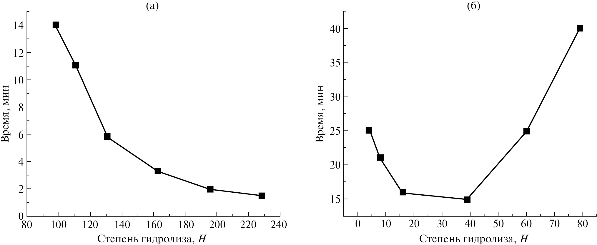 Рис. 2. Время образования плотного геля-прекурсора ЦТС при различных значениях Н. Дисперсионная среда и осаждающий агент: МЭ + H2Oдист (а), УК + ЭГ (б).