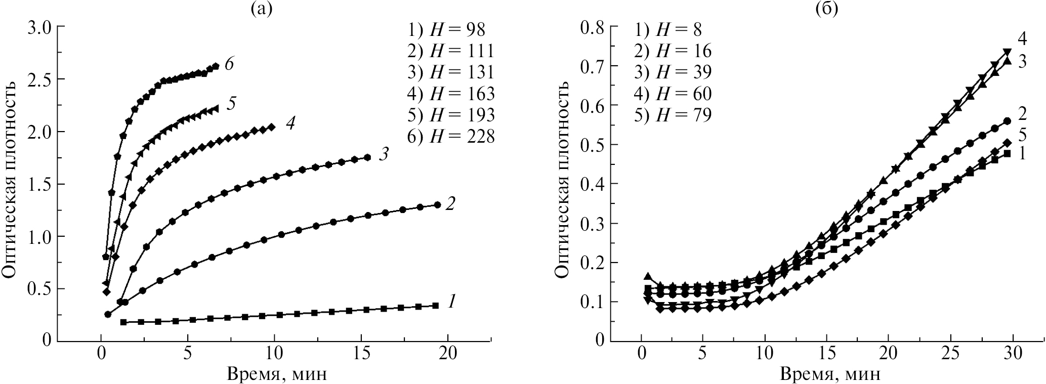 Рис. 3. Изменение оптической плотности при длине волны 550 нм в процессе гелеобразования золя-прекурсора ЦТС, полученного золь–гель методом на основе различных дисперсионных сред и осаждающих агентов: МЭ + H2Oдист (а), УК + ЭГ (б). Значения Н приведены в поле рисунков.