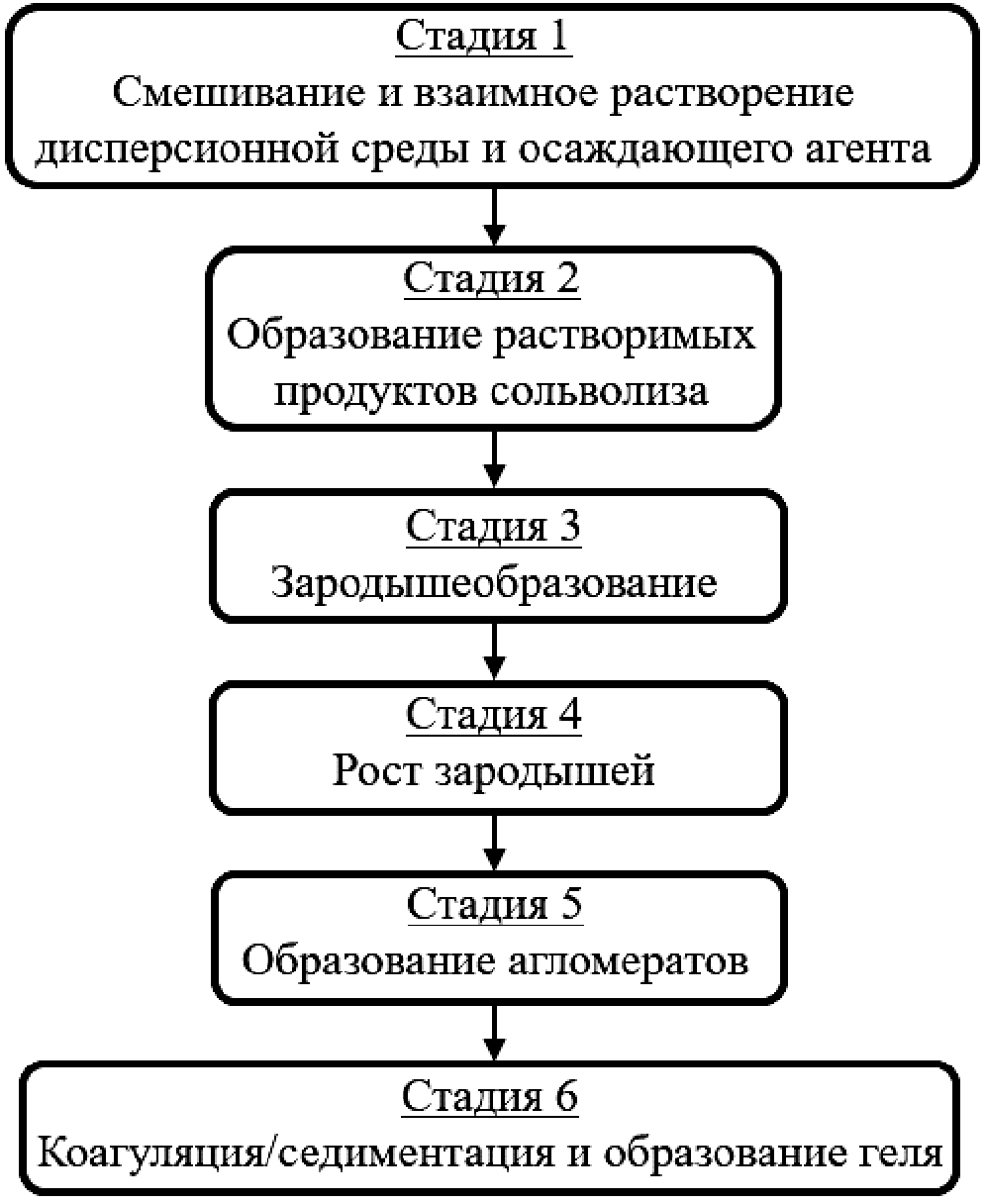 Золь образуется в результате реакции гидролиза/сольволиза алкоксидов и последующей конденсации продуктов реакции в наночастицы при добавлении гидролизующего (в общем случае – осаждающего) агента в смешанный раствор-прекурсор ЦТС. Присоединение молекулы осаждающего агента происходит по механизму нуклеофильного замещения. Например, в наиболее распространенном случае воды атом кислорода нуклеофильно присоединяется к атому металла в алкоксиде, затем происходит перенос протона внутри молекулы и формирование гидроксидов, гидроксид-ионов. Далее протекают процессы конденсации с формированием связнодисперсной системы благодаря формированию мостиковых кислородных связей между ионами металлов и ростом зародышей дисперсной фазы вследствие коагуляционных контактов между ними. Протекание этих процессов приводит к превращению раствора-прекурсора ЦТС в золь с последующим формированием пространственной сетки геля. Структура и морфология образующихся оксидных систем сильно зависят от относительного вклада каждого из процессов. Этот вклад можно оптимизировать путем тщательного изучения экспериментальных условий синтеза, которые связаны как с внутренними (природа атома металла и алкильных групп, структура молекулярного прекурсора), так и внешними (количество осаждающего агента, катализатор, концентрация, растворитель, температура) параметрами [52].
