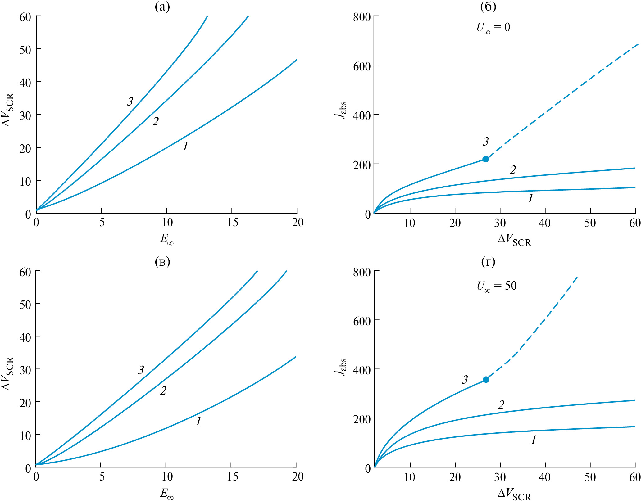 Рис. 4. (а), (в) – зависимость падения напряжения в области пространственного заряда от напряженности внешнего поля ; (б), (г) – зависимость интегрального тока от . Графики (а) и (б) построены без адвекции, , графики (в) и (г) – с адвекцией, . Кривые 1 – L = 0.1, кривые 2 – L = 0.5, кривые 3 – L = 1.0. Во всех случаях . Пунктир соответствует нестационарным режимам (с электроконвекцией), для которых значения тока усредняются по времени.