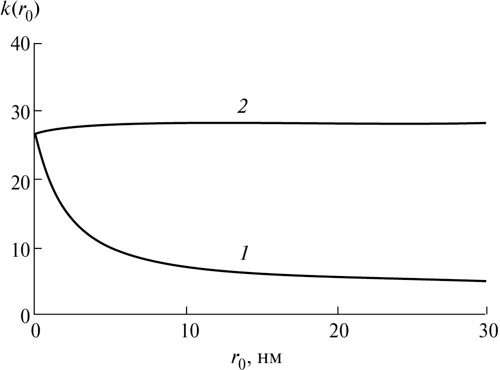 Рис. 3. График зависимости отношения P(r0)/PС(r0) от радиуса ОНП с -слоем и без него: кривая 1 – отношение давлений k0(r0) = P4(r0)/P2(r0) в чистой воде (с = 1 моль/м3); кривая 2 – отношение давлений kс(r0) = P3(r0)/P1(r0) в соленой воде (с = 100 моль/м3).