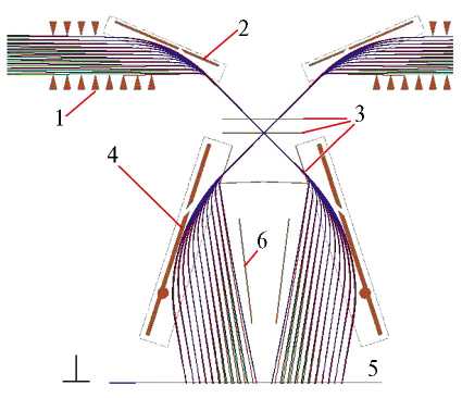 Рис. 2. Моделирование прохождения частиц через электронно-оптическую схему прибора «ТОТЭМ-Э» в программе SIMION: 1 – коллиматор; 2 – электростатическое зеркало М1; 3 – центральная диафрагма; 4 – электростатическое зеркало М2; 5 – плоскость детектора; 6 – корректирующий электрод.