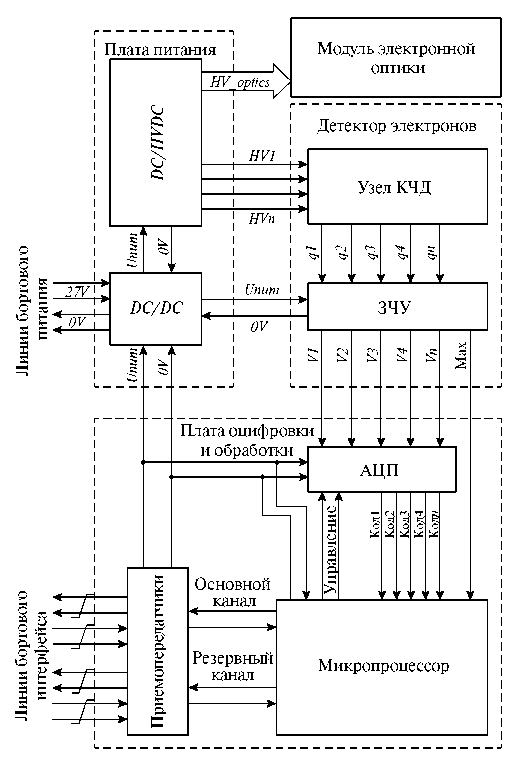 Модуль электроники прибора «ТОТЭМ-Э» включает в себя детектор на основе микроканальных пластин, электронные платы с модулями АЦП/ЦАП, высоковольтные источники питания, необходимые для подачи потенциалов на элементы электронной оптики и детектор, плату управления и плату интерфейсов. Структурная схема модуля электроники приведена на рис. 3.
