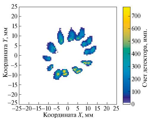 Рис. 5. Структура диафрагмы, использованной для определения пространственного разрешения детектора и распределения частиц по поверхности детектора.