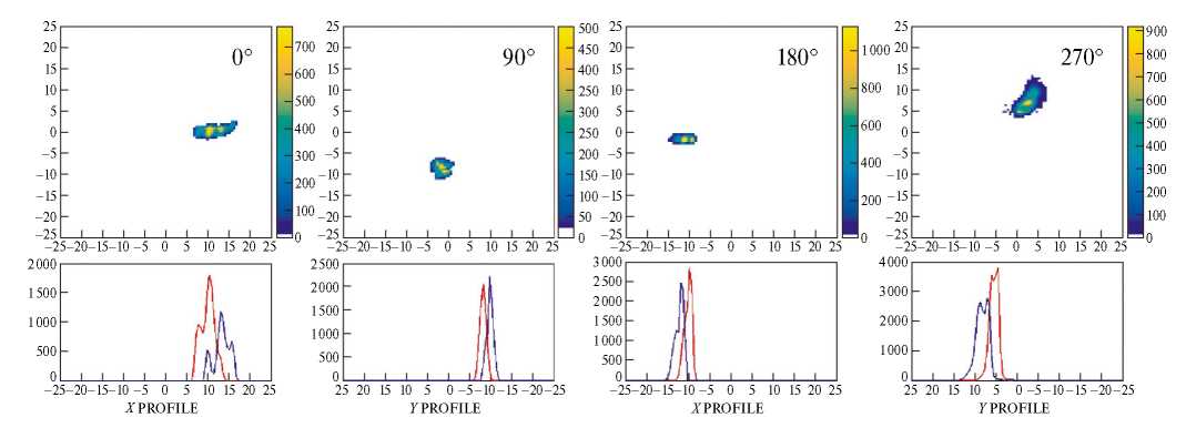 Рис. 7. Совокупное распределение частиц на детекторе прибора для набора азимутальных углов, использованных при определении углового разрешения прибора.