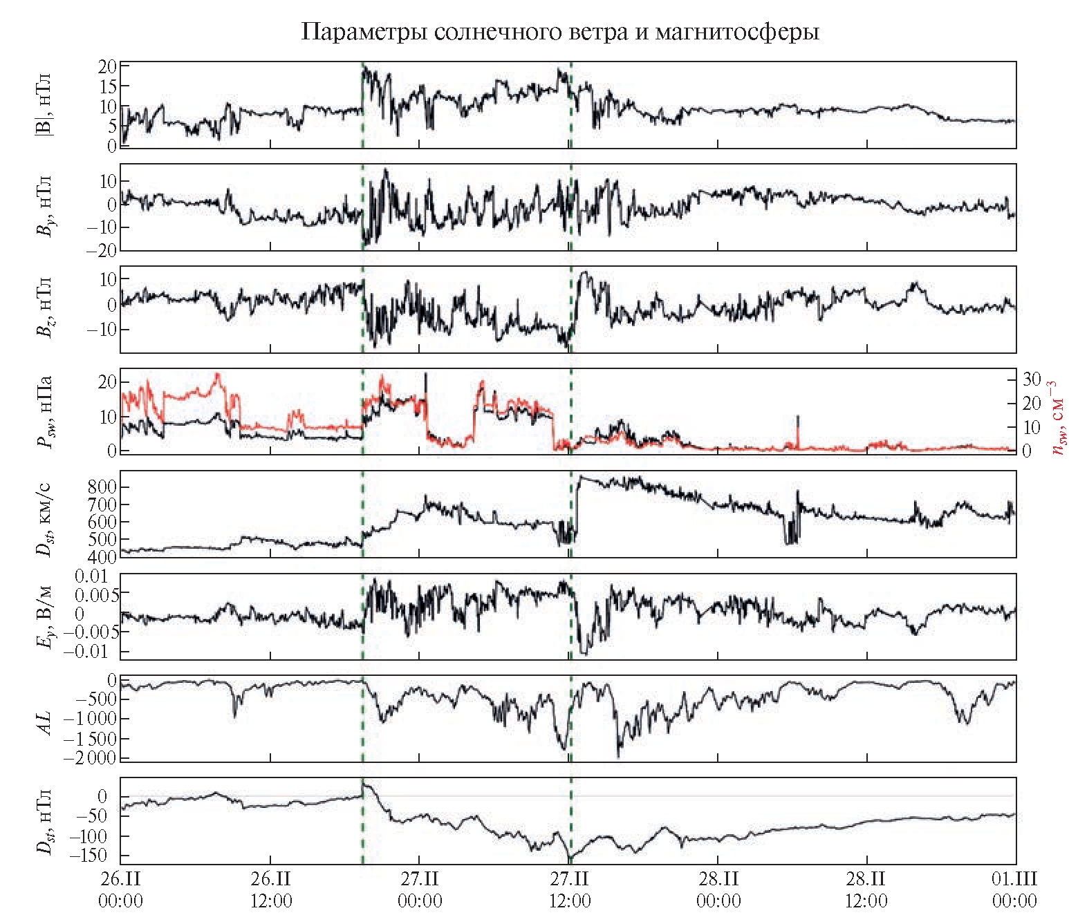 Рис. 1. Параметры солнечного ветра (плотность n, скорость v и динамическое давление Psw), ММП (|B|, By, Bz), Ey-компоненты электрического поля в солнечном ветре и параметров возмущения магнитосферы AL, Dst в период 26–28.II.2023 (https://swx.sinp.msu.ru/ Данные о солнечном ветре и ММП получаются с различных КА с учетом смещения времени конвекции примерно на 40 мин). Здесь и далее вертикальными штрихованными линиями показано время начала магнитной бури и ее максимума.