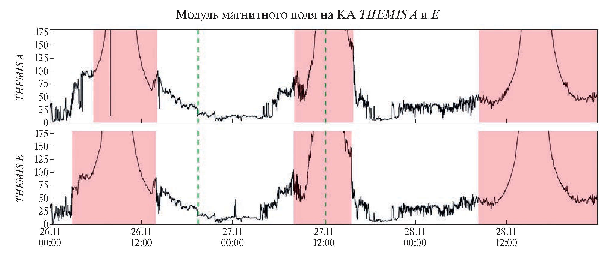 Рис. 2. Модуль магнитного поля вдоль траектории спутников THEMIS A, E, измеренный 26–28 февраля. Вертикальными пунктирными синими линиями обозначено время внезапного начала бури (19:30 UT 26 февраля) и минимума индекса Dst (12:00 UT 27 февраля). Розовым выделены те интервалы времени, в которые КА находился внутри магнитосферы.