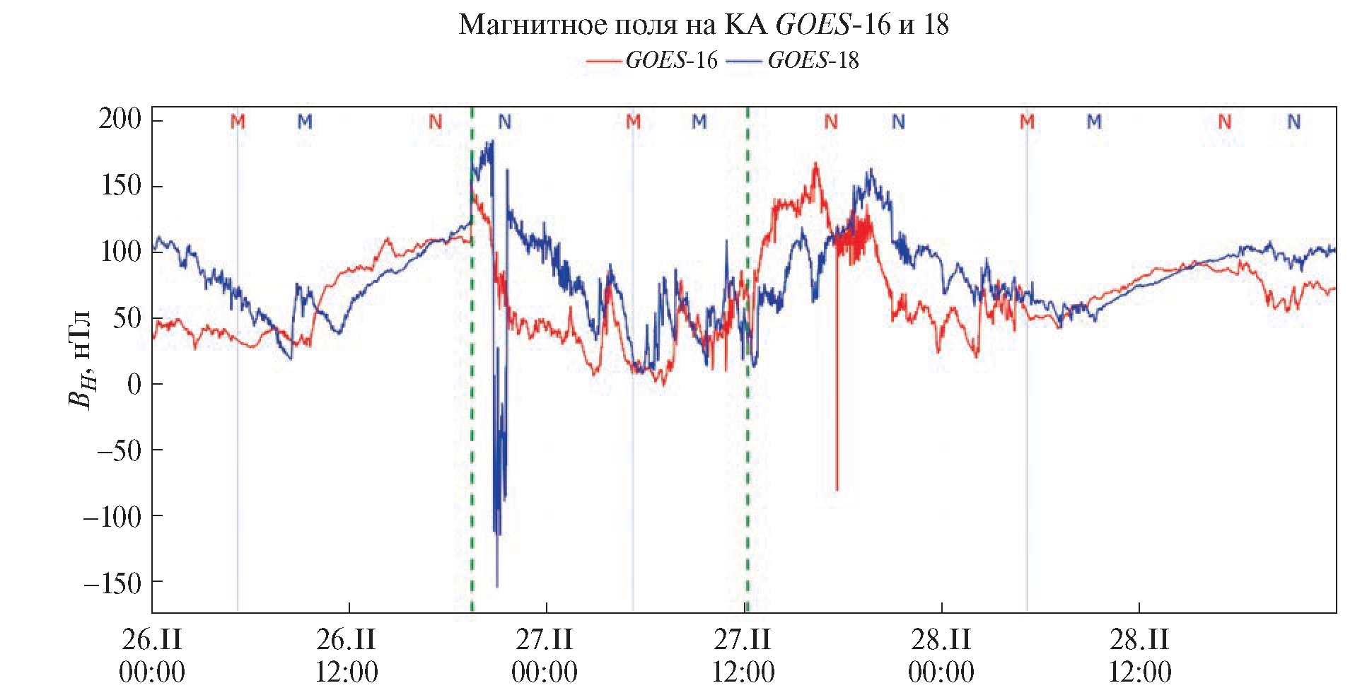 Рис. 3. -компонента магнитного поля системы VDH на геостационарной орбите в период сильно поджатой магнитосферы 26–28.II.2023 по данным КА GOES-16 и GOES-18.