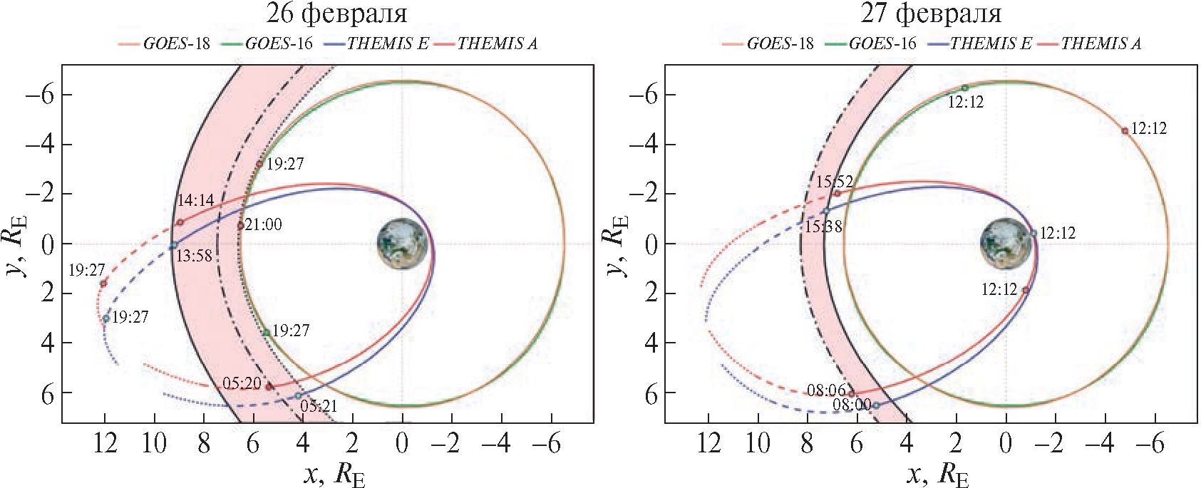 На рис. 4 показаны траектории КА THEMIS A, E и GOES-16, 18 в солнечно-магнитосферной системе координат 26 и 27 февраля. На каждую из траекторий нанесены точки пересечения магнитопаузы КА, определяемые по магнитограммам (рис. 2): пересечение магнитопаузы можно определить как переход из области турбулентного переходного слоя в область гладкой кривой спокойной магнитосферы [6] и по соответствующему резкому повороту вектора магнитного поля.