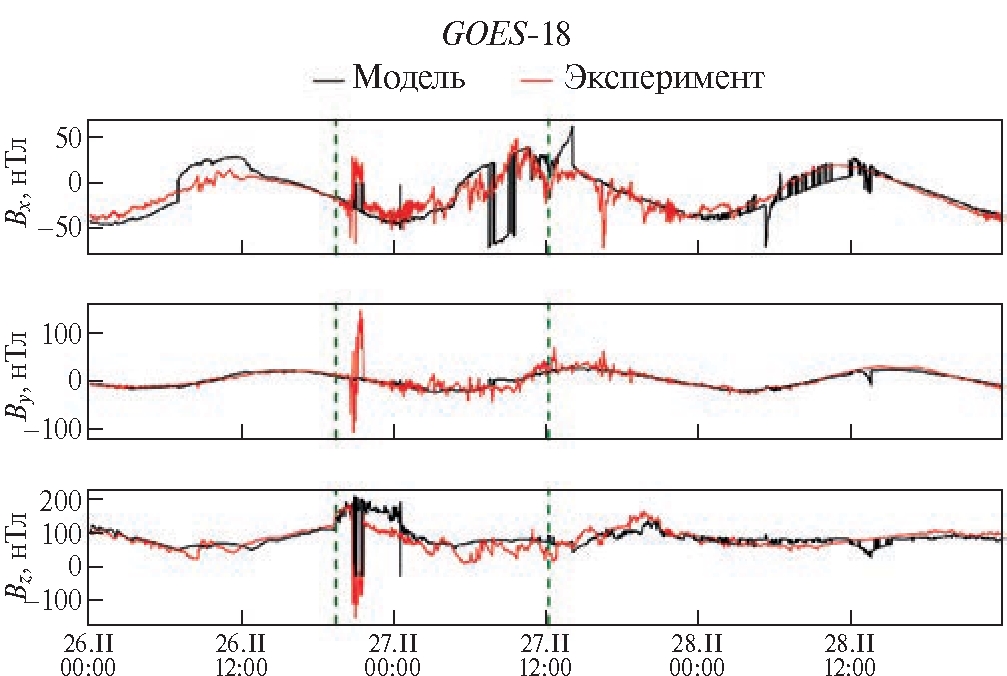 Для оценки надежности результатов расчетов по параболоидной модели сравним наблюдаемое магнитное поле со спутников GOES-16 и GOES-18 с модельным магнитным полем вдоль траектории этих КА. Результаты расчета и сравнение с измерениями представлены на рис. 7, 8.