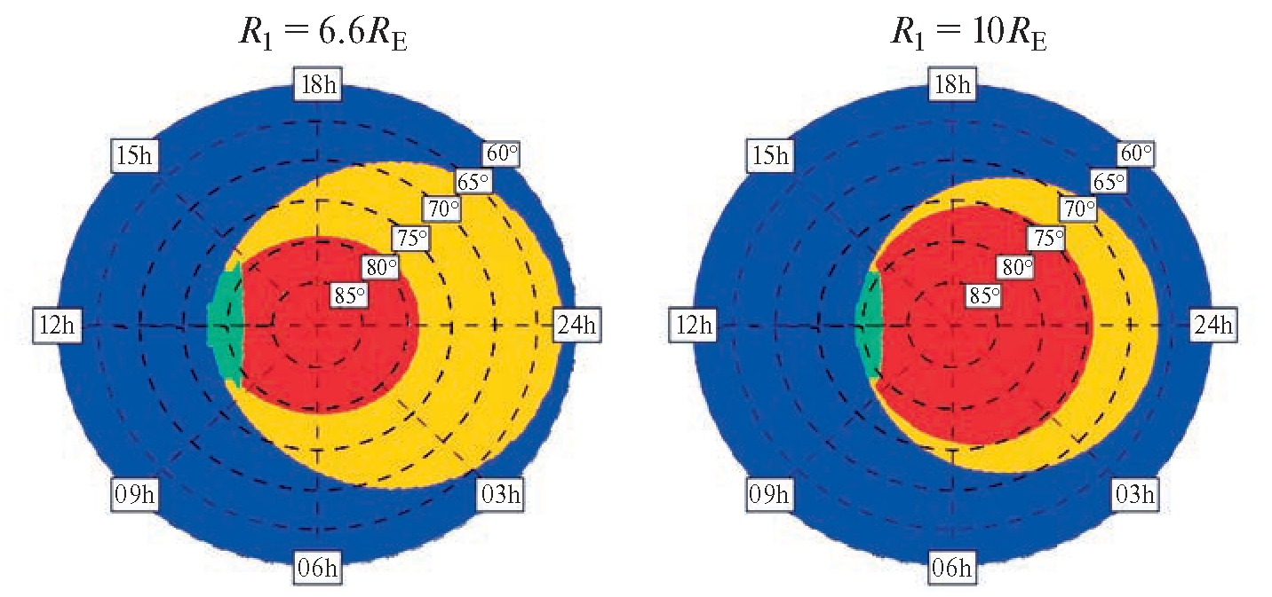 - Расстояние до переднего края токового слоя хвоста было рассчитано как проекция аврорального овала вдоль магнитной силовой линии в полуночном меридиане на широте при помощи формулы, верной в случае дипольного приближения: . Величина определяется на основе полученной эмпирически формулы из работы [20] для значений Dst < –10 нТл:
