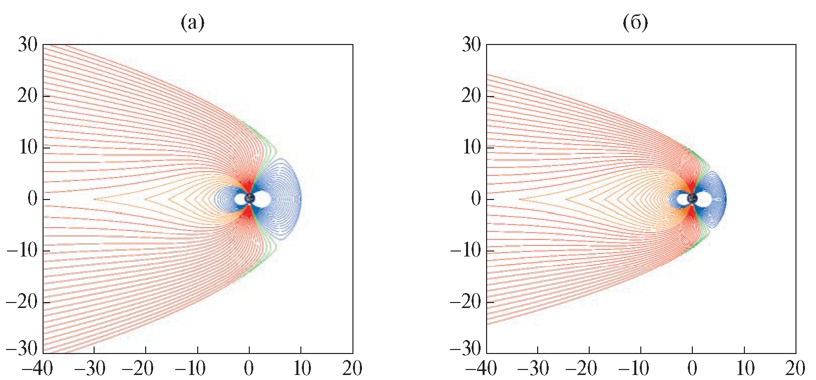 Рис. 10. Сжатие магнитосферы до геостационарной орбиты при приходе фронта коронального выброса массы во время внезапного начала магнитной бури в 19:30 UT 26.II.2023. Показано соответствующее изменение структуры магнитосферы. Нарисованы модельные силовые линии в сечении полдень – полночь в системе координат GSM для двух состояний магнитосферы, при которых расстояние до подсолнечной точки равно 10 RE (а) и 6.6 RE (б) соответственно. По осям расстояние выражено в RE. Различные типы силовых линий маркированы разными цветами. Линии каспа, которые соединяют магнитопаузу и ионосферу, окрашены зеленым цветом, открытые линии полярной шапки, уходящие в торцевое сечение хвоста магнитосферы, – красным, силовые линии аврорального овала, которые соединяют токовый слой хвоста и ионосферу, – оранжевым, а замкнутые силовые линии, которые заполняют сердцевину магнитосферы и пересекают экваториальную плоскость ближе к Земле, чем располагается передний край токового слоя, – синим.