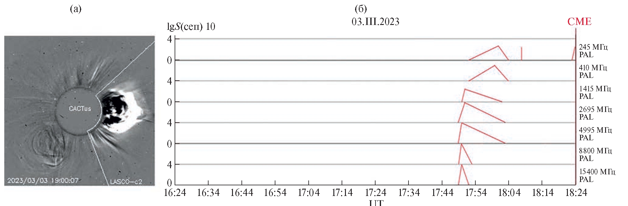 КВМ 03.III.2023 (рис. 3а) связан с АО 3234, расположенной на западном лимбе, там же произошла мощная вспышка (Х2.1). Радиопредвестники КВМ (рис. 3б) наблюдаются на 7 частотах микроволнового диапазона. Отметим, начало радиоизлучения регистрируется одновременно на 4 частотах (15400, 8800, 4995 и 2695 МГц), которые генерируются на разных высотах атмосферы Солнца, что может свидетельствовать о месте и размере процесса формирования КВМ.
