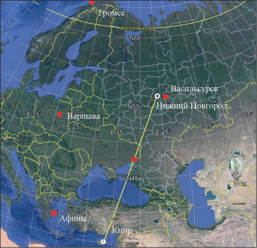 Критические частоты F-слоя ионосферы по данным ионозонда CADI, расположенного в п. Васильсурск (56.15°N, 46.10°E; 50.77°N, 129.13°E), были получены в ходе специальных измерений. Ионозонд работал в 15-минутном режиме зондирования ионосферы в диапазоне частот 1–12 МГц. Данные максимальных наблюдаемых частот F-слоя ионосферы приводятся по результатам специальных измерений на трассе Кипр – г. Нижний Новгород. Прием ЛЧМ-сигнала проводился каждые 5 мин в диапазоне 8–33 МГц. Координаты всех станций вертикального зондирования, данные которых использовались в статье, приведены рядом с их названием, а взаимное расположение станций вертикального зондирования (отмечены красными точками) и трассы наклонного зондирования (показана желтой линией) приведены на рис. 1. Средняя точка трассы Кипр – г. Нижний Новгород (отмечена также красной точкой) имеет координаты 45.6°N, 37.45°E – географические; 41.61°N, 118.15°E – геомагнитные.