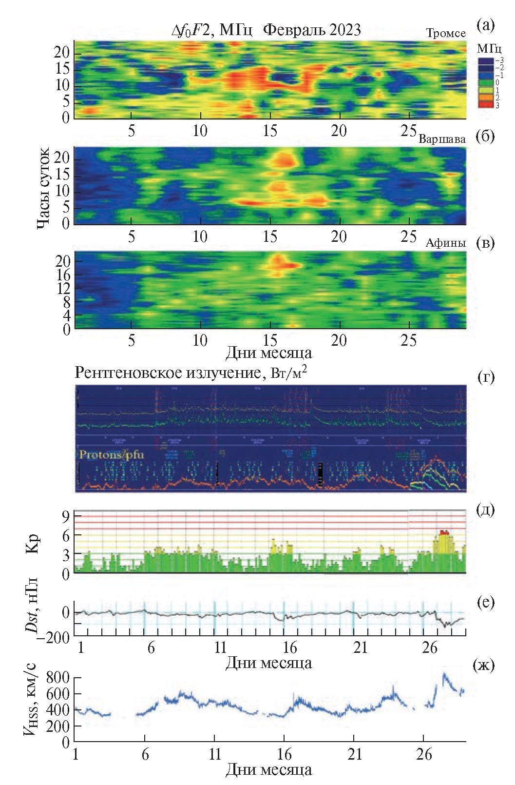 Рис. 2. Поведение индекса ΔfоF2 для 3 ионосферных станций: Афины (в), Варшава (б), Тромсё (а); временной ход рентгеновского излучения и потока протонов (г); индексы Кp (д) и Dst (е); график скорости высокоскоростных потоков солнечного ветра (VHSS, км/с) за февраль 2023 г. Горизонтальная ось – дни месяца; левая вертикальная ось: для ΔfоF2 – время суток (ч, UT), для всех остальных – значения величин.