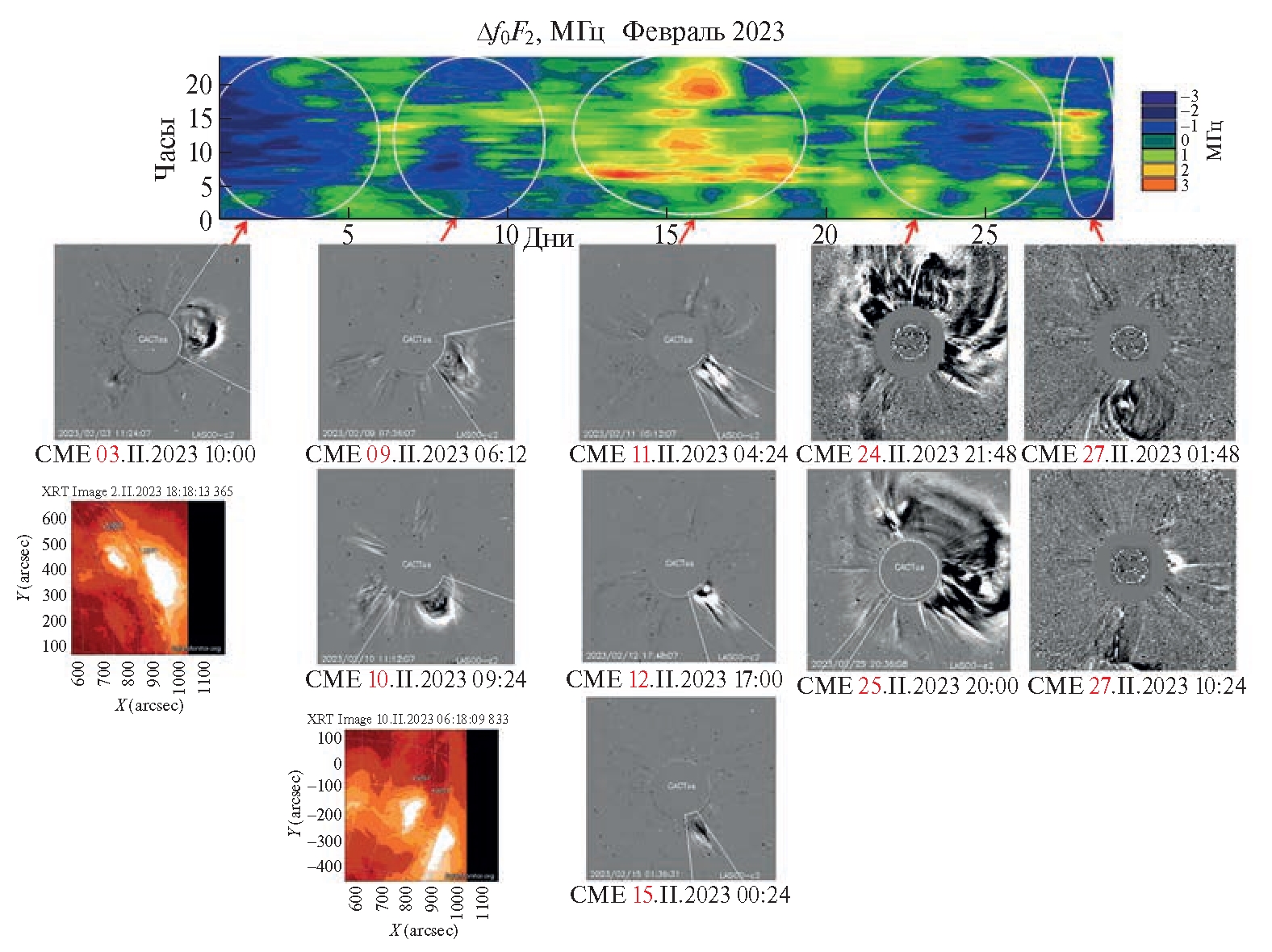 Примеры сопоставлений зарегистрированных КВМ и наблюдаемых ионосферных возмущений в феврале 2023 г. показаны на рис. 4 на примере ионосферных данных Варшавы. С учетом Кр- и Dst-индексов такое сопоставление позволяет идентифицировать возможный источник влияния на критические частоты F-слоя ионосферы и рассматривать КВМ как источник ионосферных возмущений.