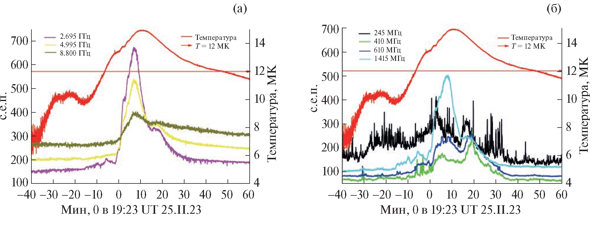 Рис. 5. Вспышка 4 (M6.3) 25 февраля 2023 г.: (а) температура вспышечной плазмы и радиоизлучение 8.8–2695 МГц, (б) температура вспышечной плазмы и радиоизлучение 1415–245 МГц.