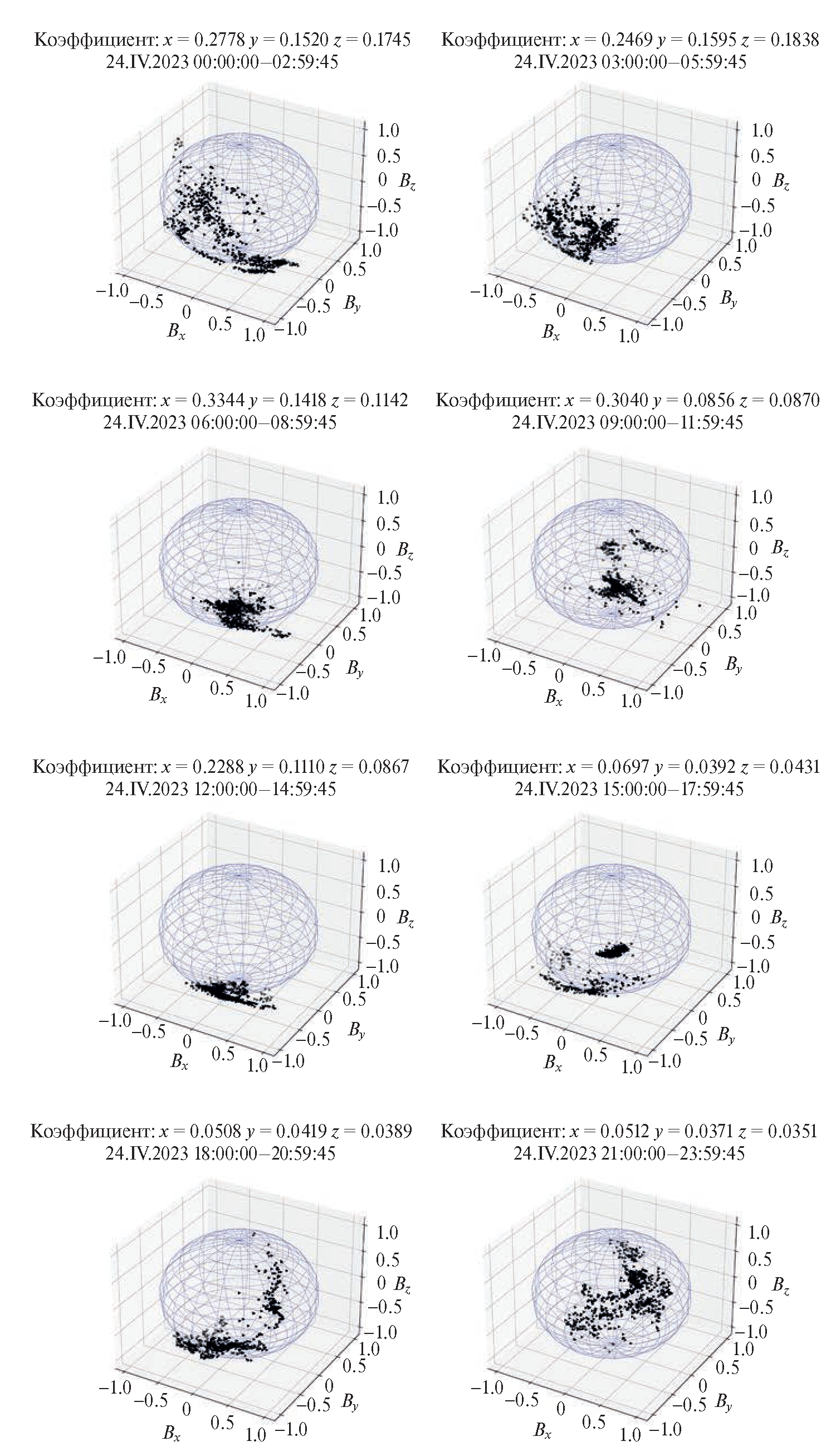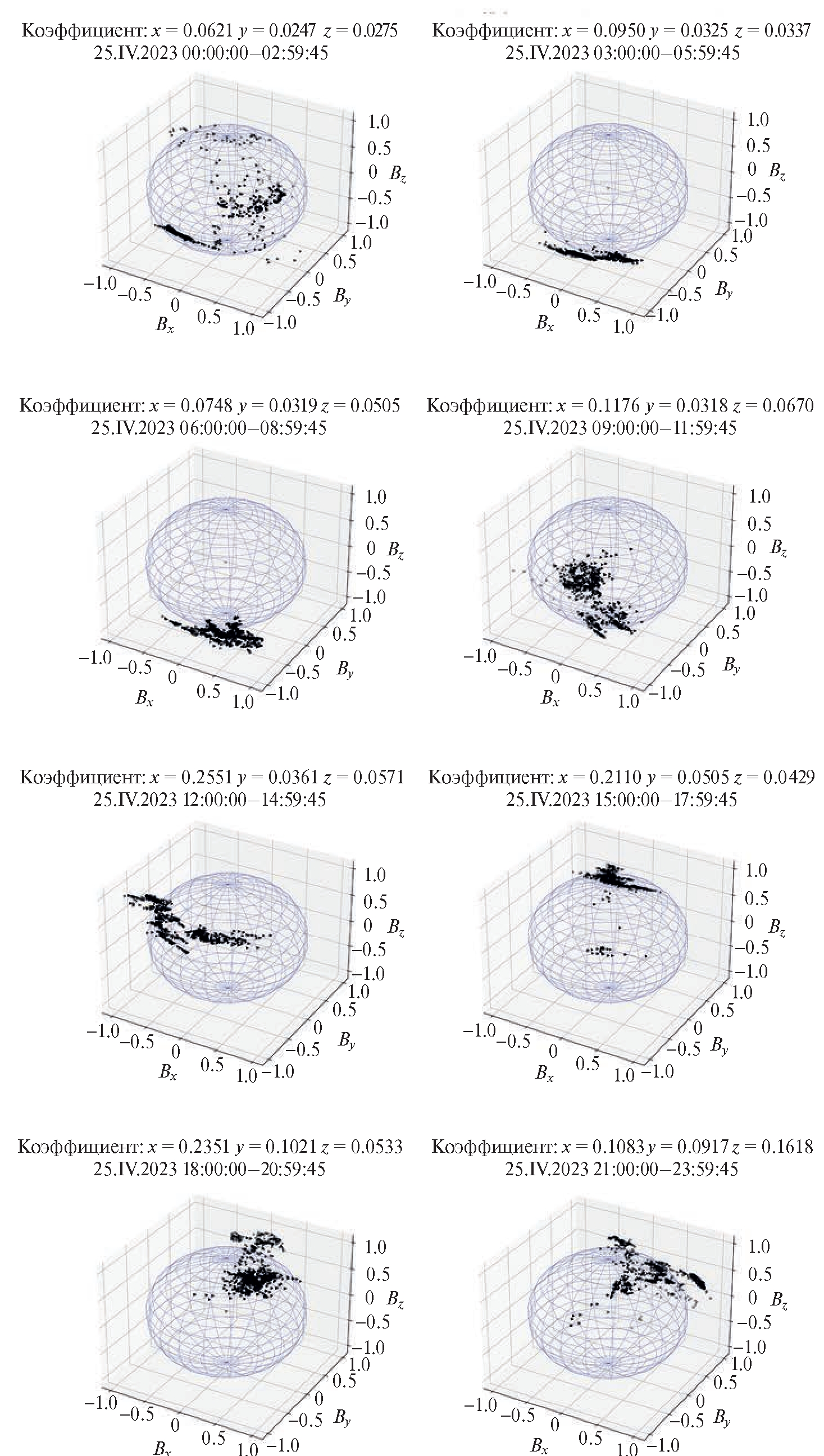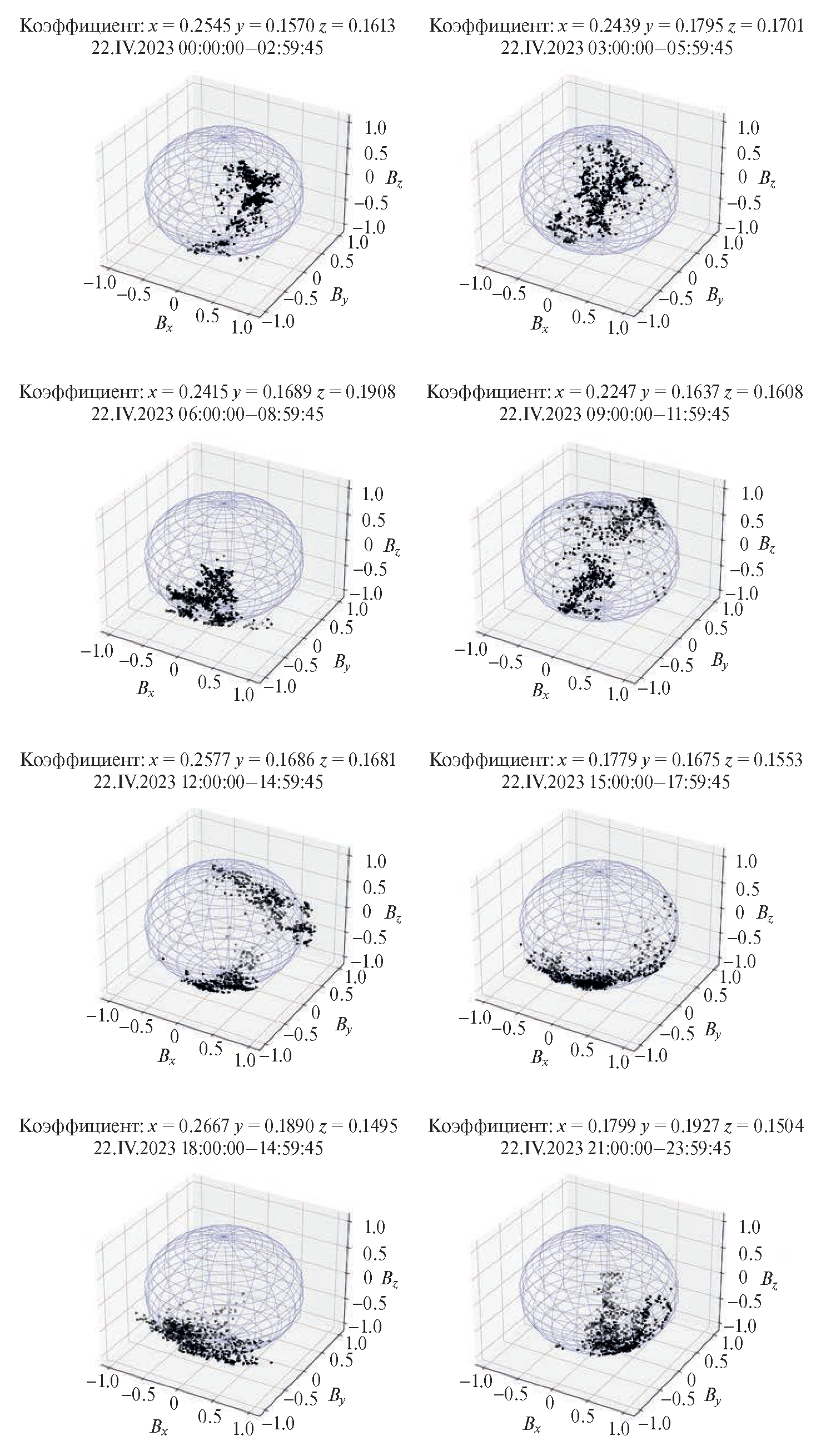 Для суточного интервала 15.IV.2023, соответствующего спокойному магнитному полю, аппарат находился в секторе магнитного поля Солнца [16]. Определение знака сектора было выполнено на основе анализа недельного временного ряда для Bx-компоненты, прошедшего через фильтр низких частот с окном усреднения в 10 000 отсчетов при частоте дискретизации в 15 с. На рис. 2 представлена серия из 8 векторных графов, полученных на основе рядов с интервалами опроса 15 с и временем накопления реализаций 3 ч. Анализируемые графы имеют сложную структуру, относятся к циклическим графам, не обладают свойствами деревьев. При анализе пространственных структур, проецируемых на нормированную опорную поверхность можно определить ряд характеристик, общих для отображаемой серии: