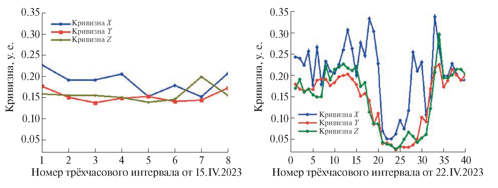 Рис. 9. Вариация нормирующих коэффициентов кривизны со временем: слева – для 15 апреля, справа – для интервала 22–26 апреля 2023 г.