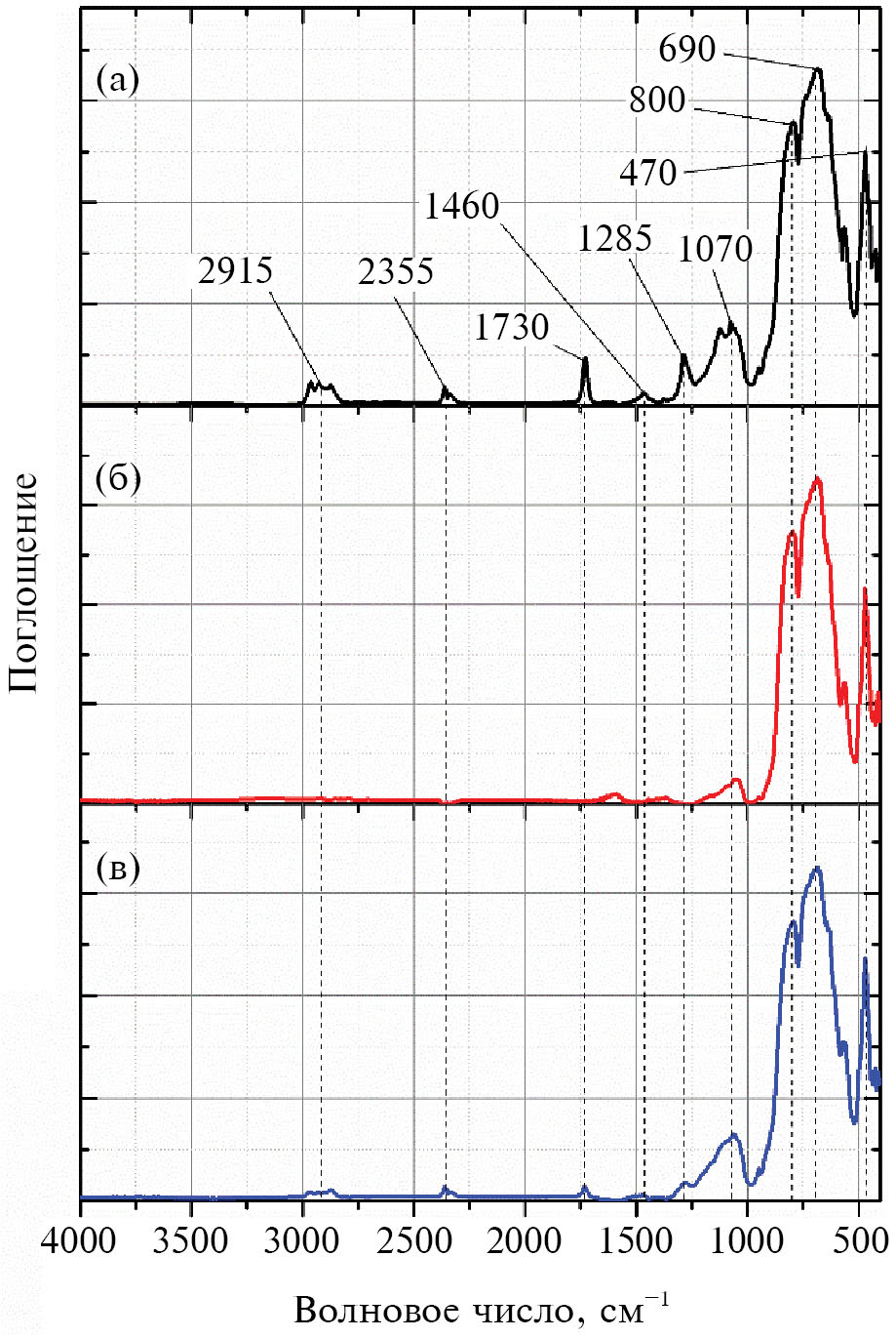 Исследование ИК-спектров сырой пасты показали (рис. 1) наличие полос поглощения при 470, 690, 800, 1070, 1285, 1460, 1730, 2355 и 2915 см–1. Наиболее интенсивными являются полосы при 470, 690, 800, 1070 см–1. Полосы при 470 и 1070 могут быть отнесены к характеристическим полосам поглощения связи Al — O в α-Al2O3 [7, 8]. В области от 600 см–1 до 800 см–1 полосы поглощения соответствуют деформационным и валентным колебаниям Al2O3 [9]. Полоса при 2355 см–1 относится к колебаниям CO2 [10], полосы при 1285 и 1460 см–1 соответствуют деформационным колебаниям H2O [11]. Прогрев и дальнейший отжиг пасты приводят к уменьшению интенсивности и исчезновению полос поглощения, обусловленных колебаниями молекул воды и диоксида углерода. В спектрах остаются только полосы, обусловленные колебаниями молекул Al2O3. Поэтому можно заключить, что нанесенная на подложку паста ДКП после ее прогрева и отжига представляет собой ТРП, состоящее только из оксида алюминия.